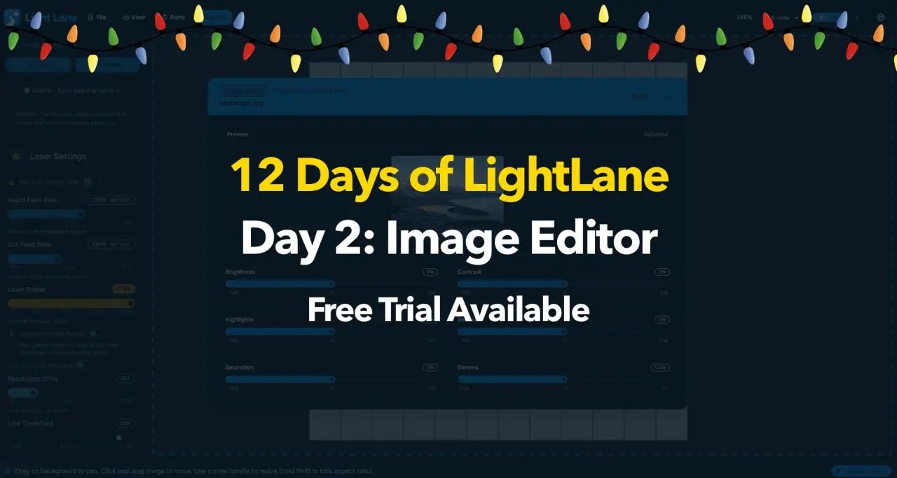 If your source photo is too flat, too dark, or blown out, your engrave will be the same. That’s why Day 2 of 12 Days of Light Lane is a new built-in Image Editor, designed specifically for getting better, more predictable results when engraving photos and shaded artwork.