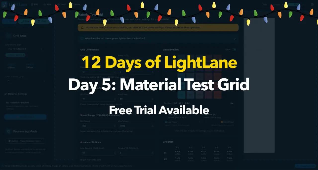 Today’s Day 5 release adds a Material Test Grid to Light Lane: a fast, visual way to generate a calibration grid that sweeps through a range of power and speed settings, so you can find the sweet spot for your material and your machine.
